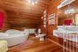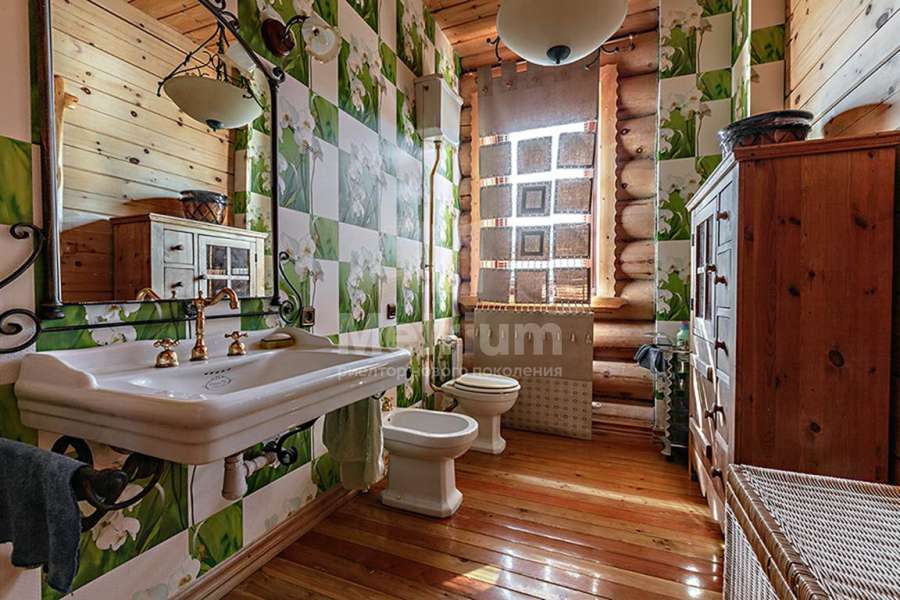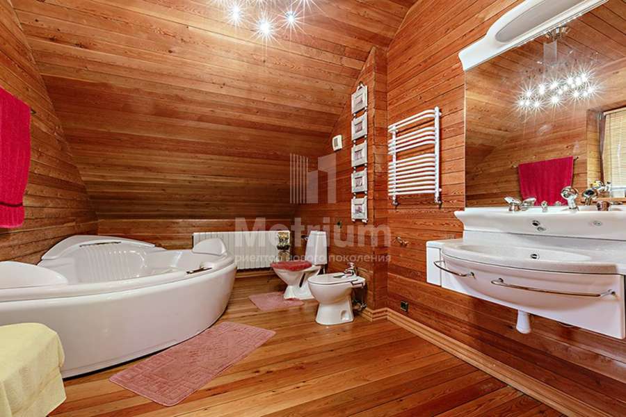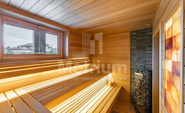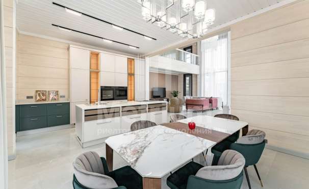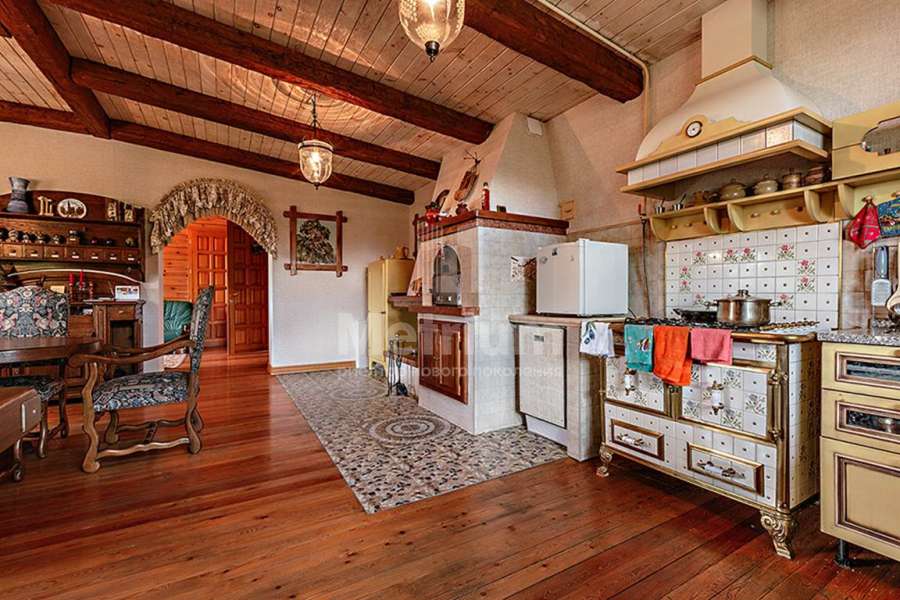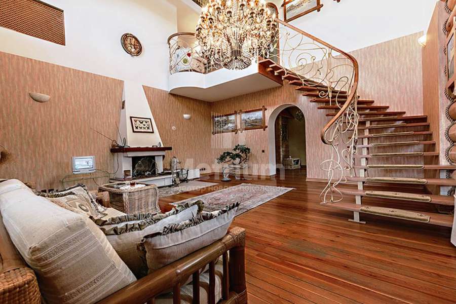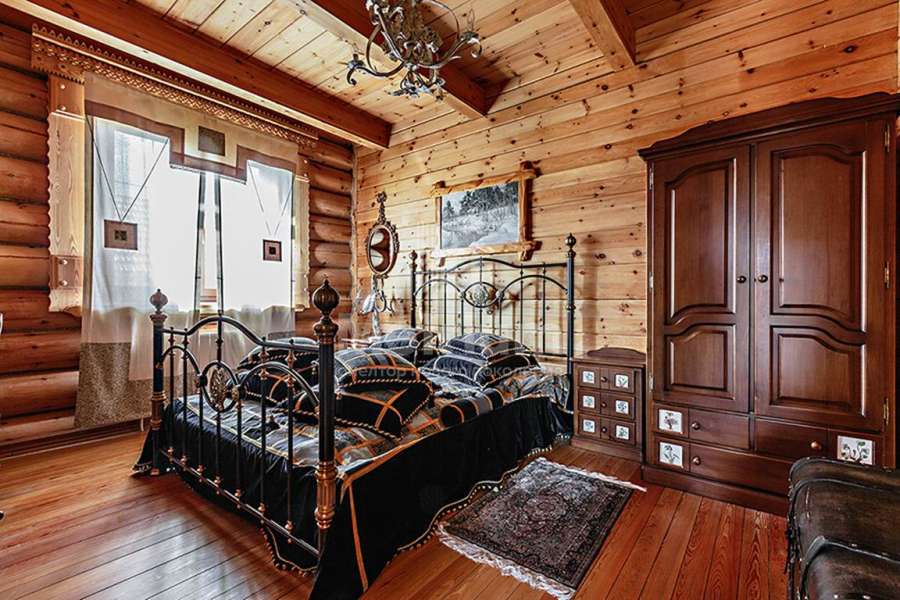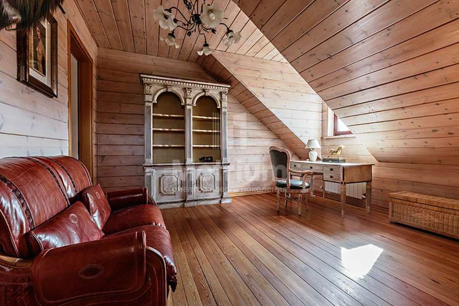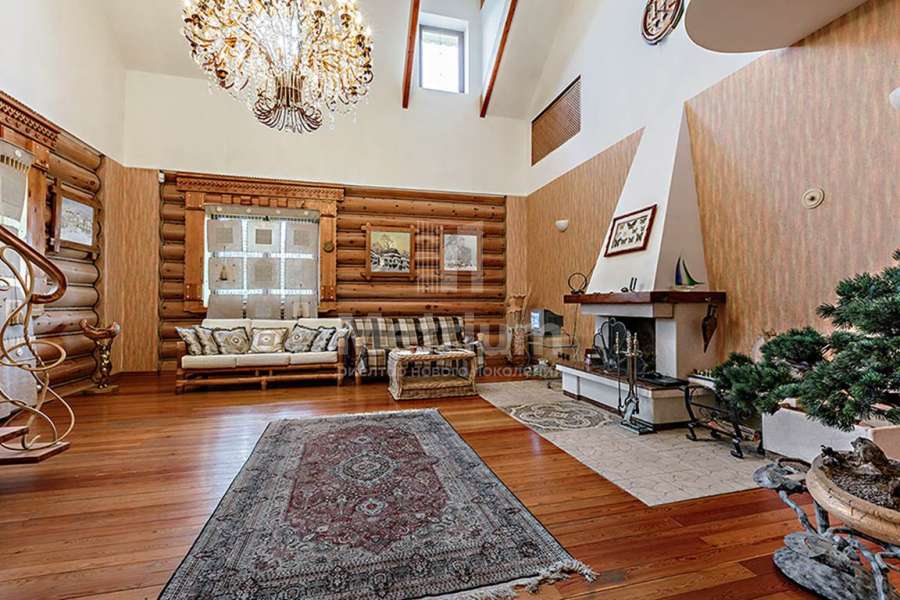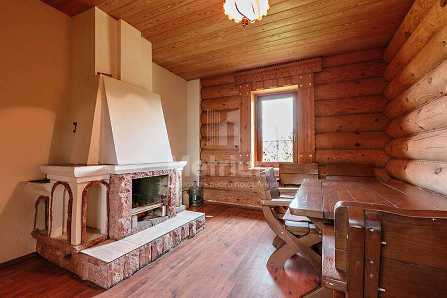 Дом построен из реликтового кедра, диаметр бревна 32 см. Коттедж полностью готов для жизни, в нем по-настоящему спокойно и уютно, выполнена отделка из качественных материалов, установлена техника от ведущих производителей. Центром притяжения является гостиная с камином и со вторым светом, есть выход на веранду.