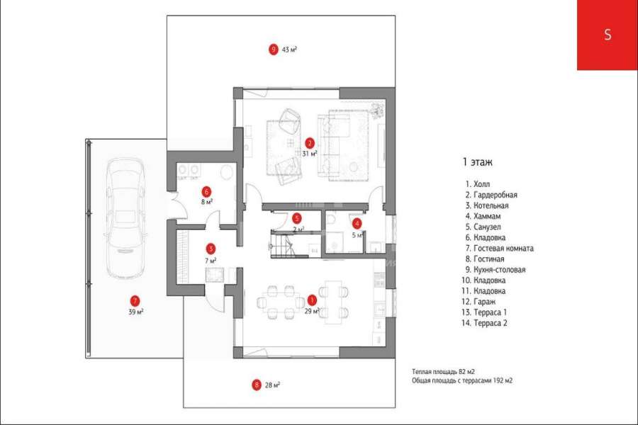 - По всему первому этажу установлены теплые водяные полы. Выполнена разводка электричества, проведен газ и организована газовая котельная с оборудованием Baxi. Предусмотрена система резервного отопления. Проведены трассы под кондиционеры. Предусмотрено место для хаммама.
