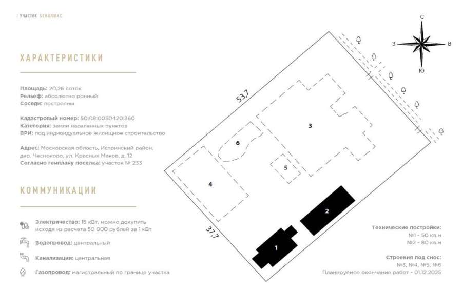 Участок лесной, со взрослыми деревьями, правильной прямоугольной формы (53,7 * 37,7 м), без рельефа. Подведено электричество 15 кВт, на участке располагается техническое строение площадью 50 кв.м, которое можно использовать как будущий “строительный городок”.
